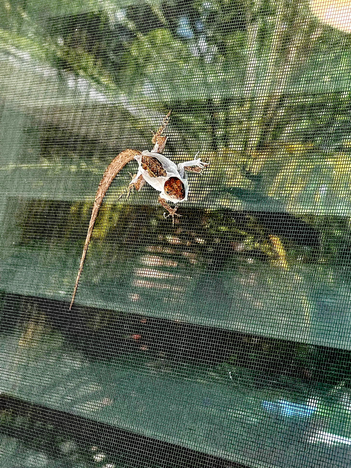 At first, I thought this could just be a high-fashion lizard. Then, I began to worry that it was trapped in some sort of plastic lining. But then, I noticed that it was NIBBLING away at this layer of something that was PERFECTLY the shape of its silhouette.